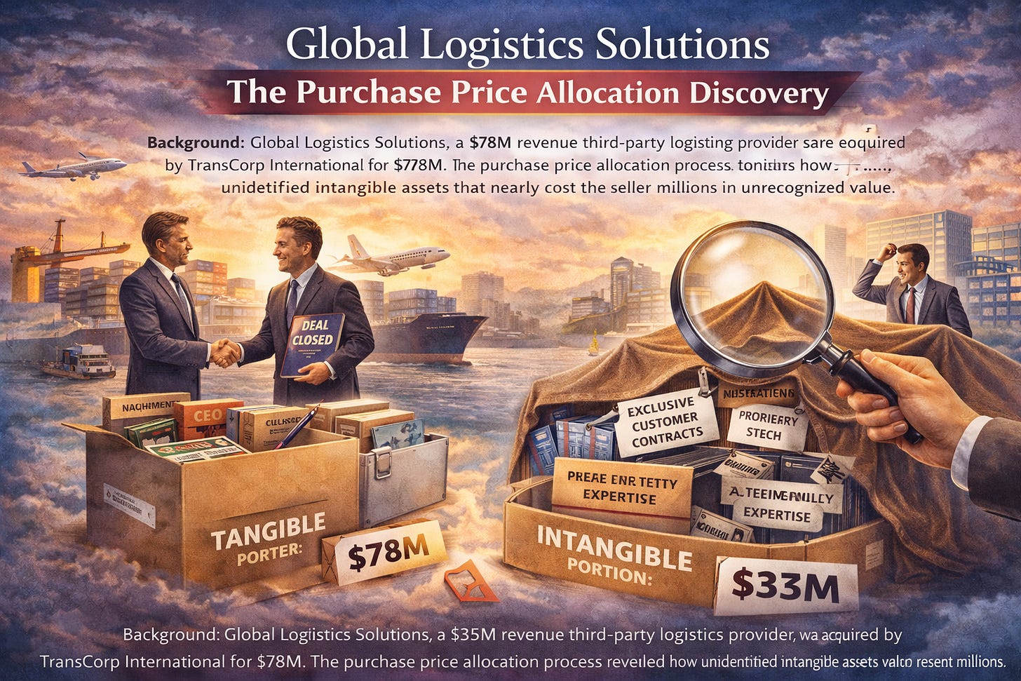 Background: Global Logistics Solutions, a $35M revenue third-party logistics provider, was acquired by TransCorp International for $78M. The purchase price allocation process revealed how unidentified intangible assets had nearly cost the seller millions in unrecognized value.