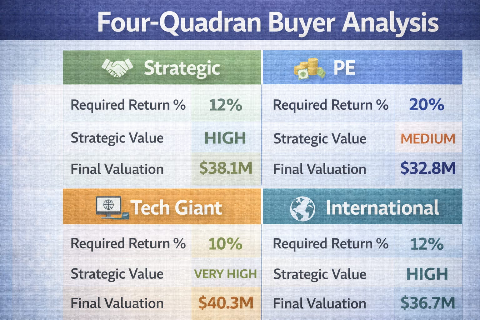 Value Multiplication Analysis: The same $3.6M EBITDA business generated four different valuations based on buyer-specific required returns and strategic needs: