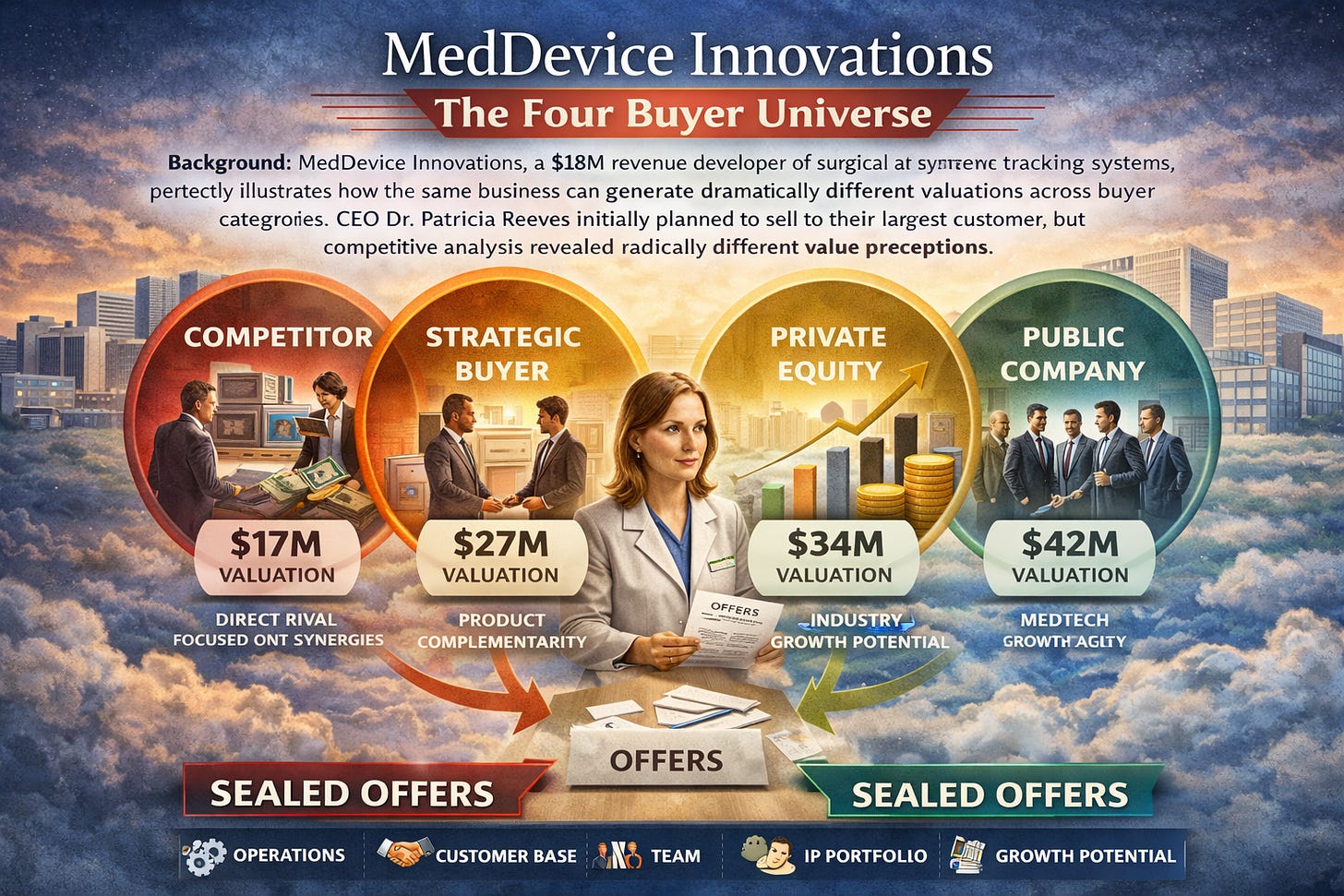 Background: MedDevice Innovations, a $18M revenue developer of surgical instrument tracking systems, perfectly illustrates how the same business can generate dramatically different valuations across buyer categories. CEO Dr. Patricia Reeves initially planned to sell to their largest customer, but competitive analysis revealed radically different value perceptions.